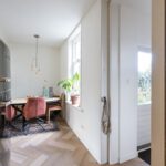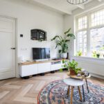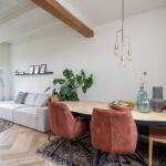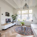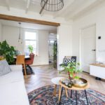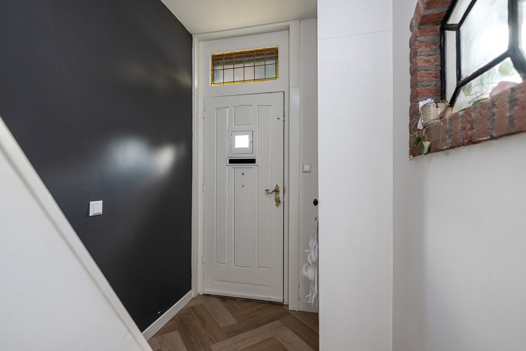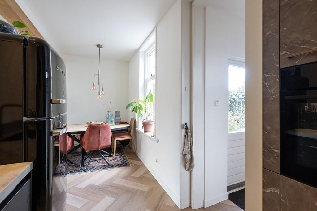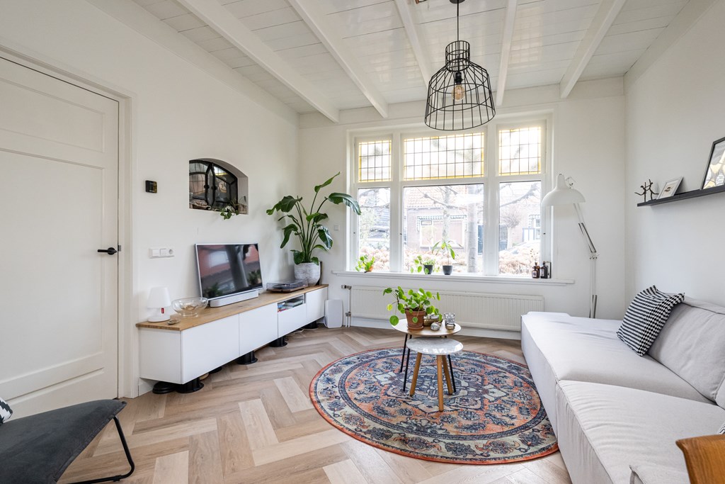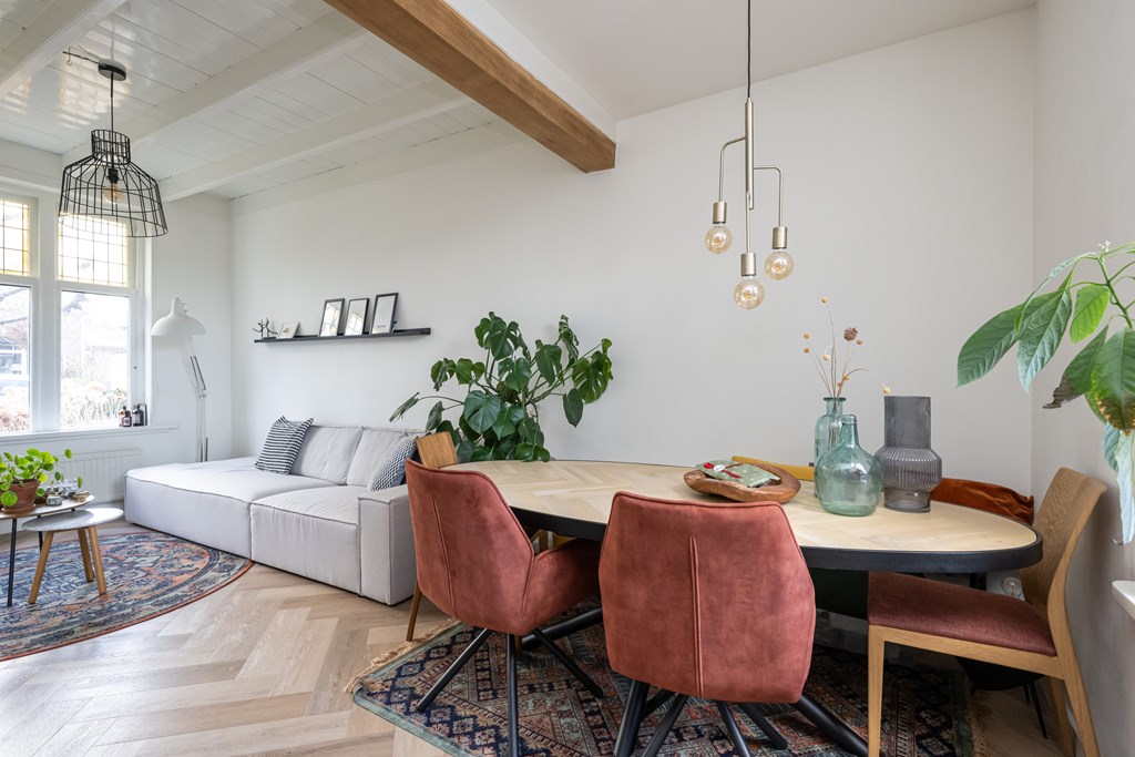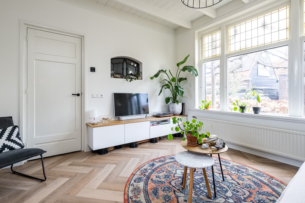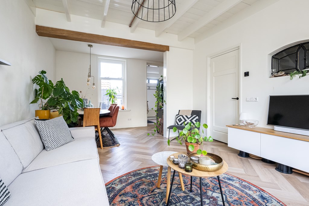 Binnen wordt u verwelkomd in een woning die met veel gevoel voor stijl is ingericht. De begane grond is afgewerkt met een stijlvolle PVC-visgraadvloer, die direct zorgt voor een warme en luxe uitstraling. De combinatie van karakter en modern wooncomfort is hier bijzonder goed geslaagd. In de woonkamer vallen meteen de fraaie glas-in-loodramen aan de voorzijde op. Deze authentieke details geven de ruimte een charmante, uitnodigende sfeer en zorgen samen met het balkenplafond voor een interieur met een eigen gezicht. Het is precies dat soort uitstraling waar u op hoopt bij een woning met karakter.