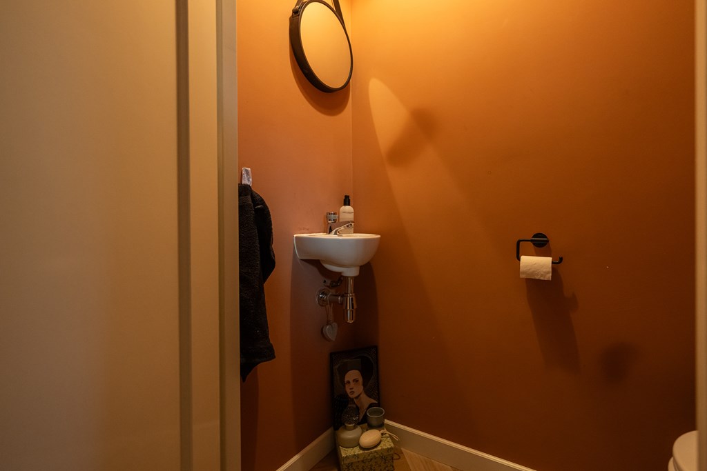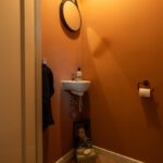 Zwevend, wastafel, gestucte wanden en PVC-visgraadvloer.