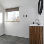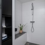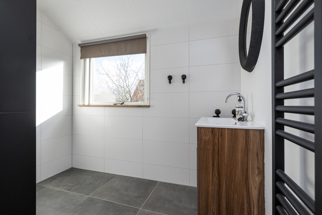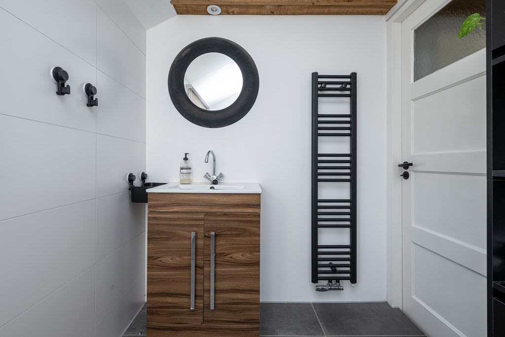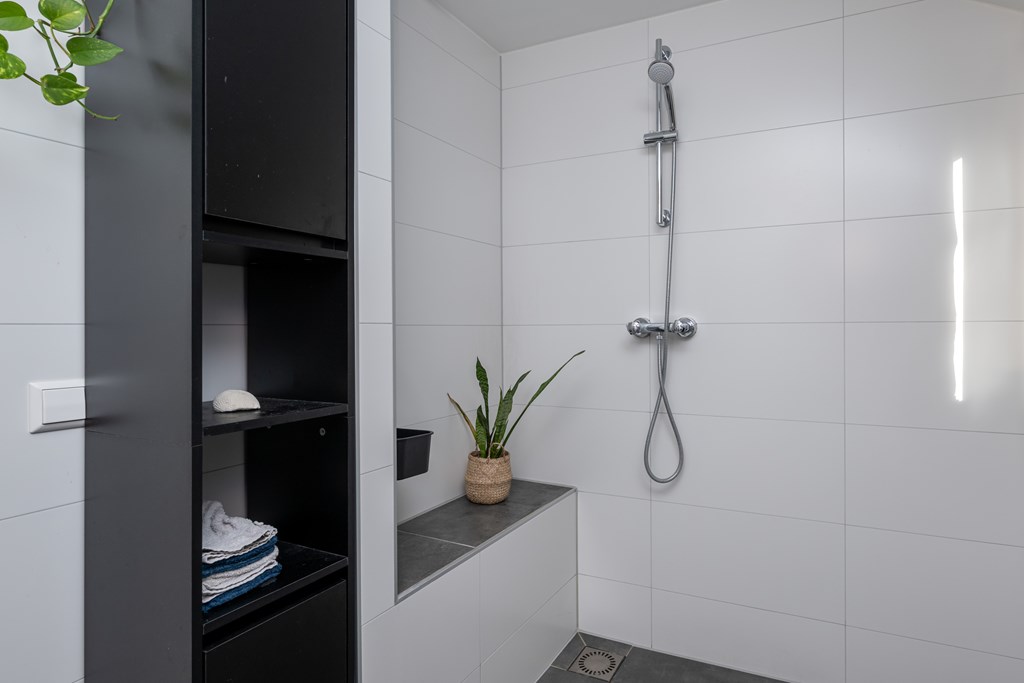 Douche, wastafel met meubel, designradiator, spots in het plafond en geheel betegeld.