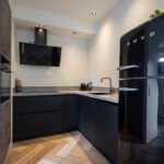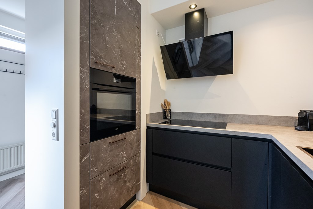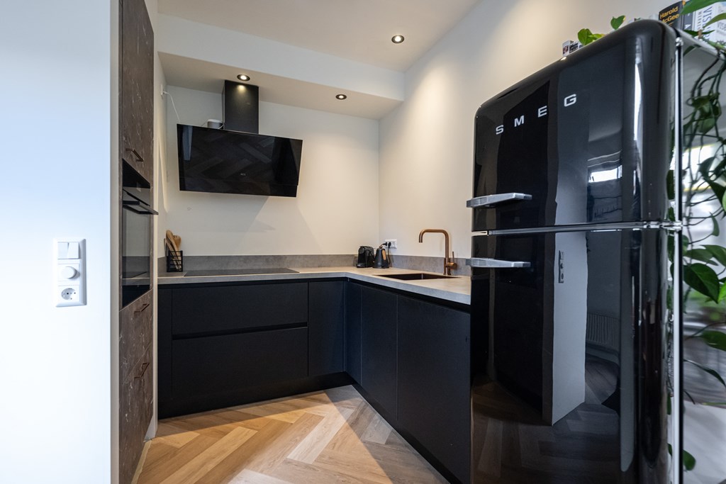 PVC-visgraadvloer, vloerverwarming, enkele spoelbak, vaatwasser, inductie kookplaat, afzuigkap, combimagnetron, koel/vriescombinatie (kan worden overgenomen) en spots in het plafond.