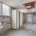 CV ketel (Remeha Tzerra 2014), uitstortgootsteen, betonnen vloer en toegang bergzolder.
