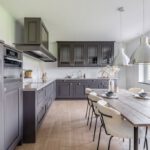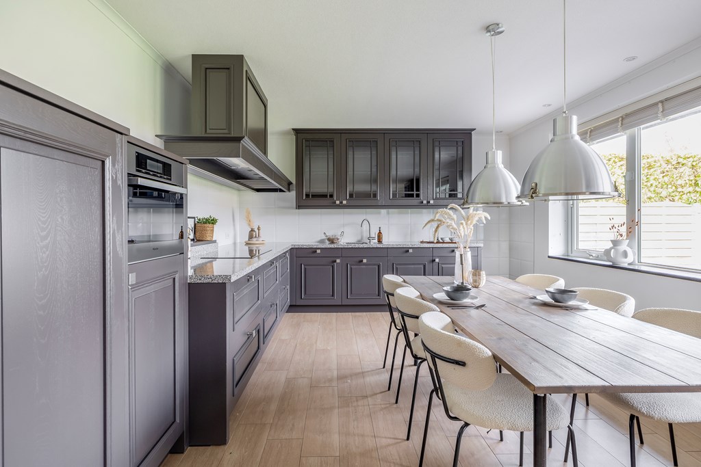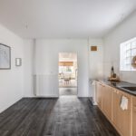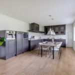 Plavuizen vloer v.v. vloerverwarming, inductiekookplaat, 3 fase, vaatwasser, close-in boiler, stoomoven, koelkast, vriezer, combimagnetron, afzuigkap en composiet werkblad