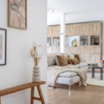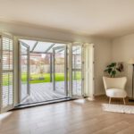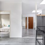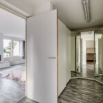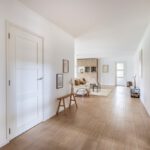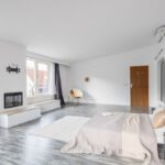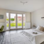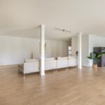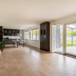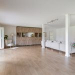 Plavuizen vloer v.v. vloerverwarming, dubbel openslaande deuren en een vaste kastenwand.