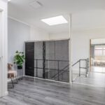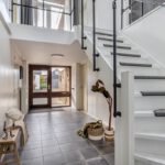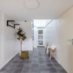 Plavuizen vloer, trapopgang, radiator en toegang garage en kantoor.