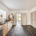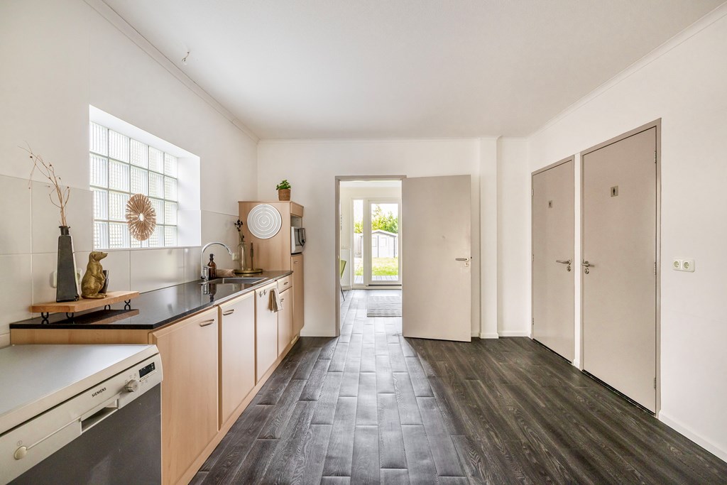 Enkele spoelbak, koelkast, vaatwasser, combimagnetron radiator en PVC-vloer.
