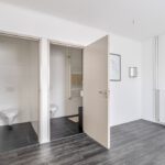 Zwevend toilet, wastafel, vloerverwarming en geheel betegeld.