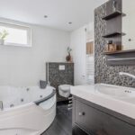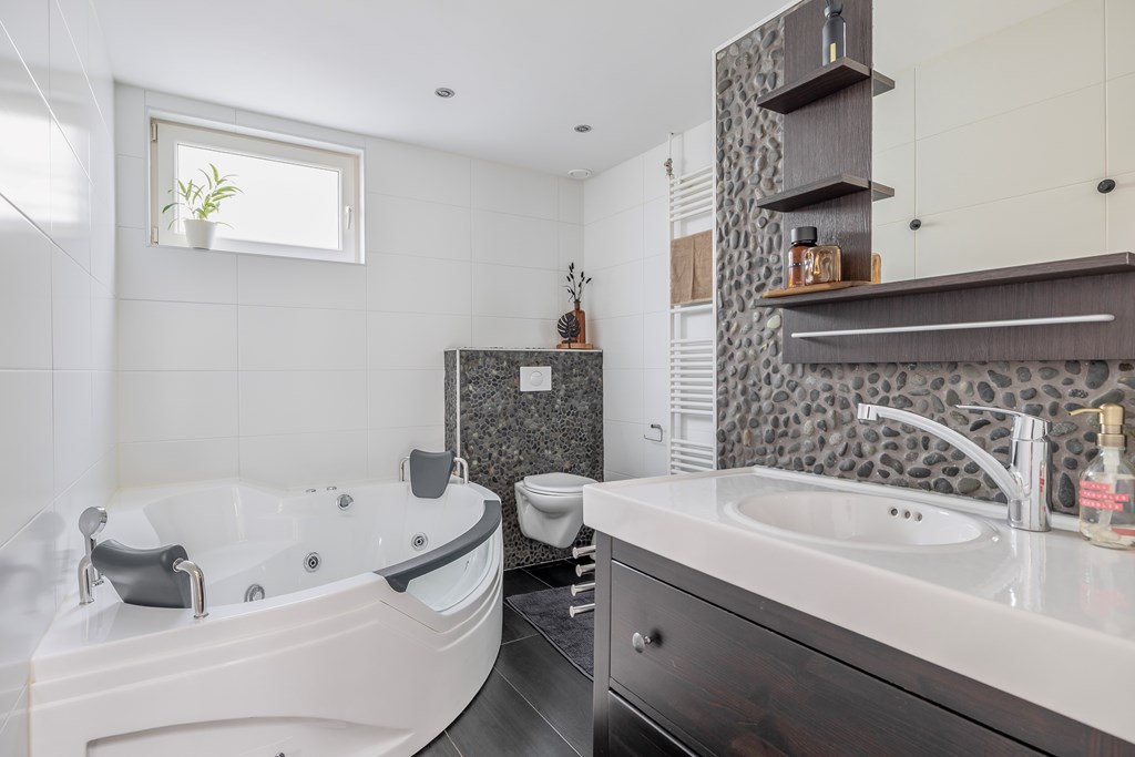 Duo ligbad met streams, zwevend toilet, douche, wastafel met meubel, spots in het plafond, handdoekenradiator, mechanische afzuiging en geheel betegeld.