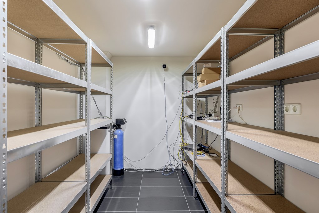 Meterkast, radiatoren, vaste kast, waterontharder en bergruimte.