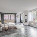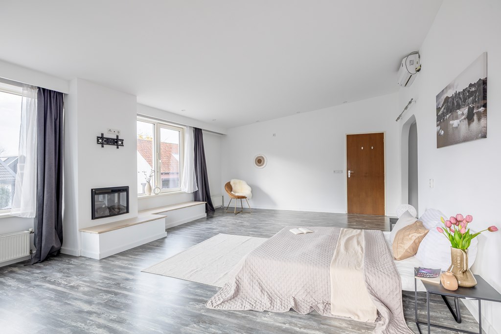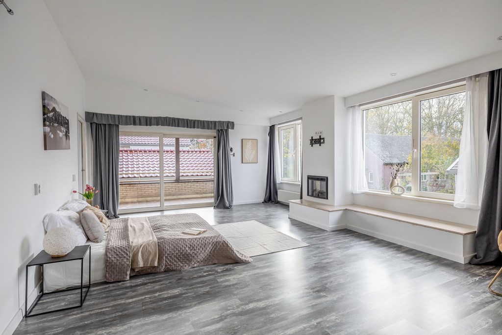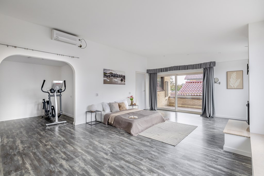 De master bedroom (6,59m bij 4,76m) met aangrenzend een fitnesskamer (2,58m bij 2,28m) v.v. een laminaatvloer, radiatoren, airco (2019), toegang tot balkon via een grote schuifpui, sierhaard, inloopkast en elektrische rolluiken.