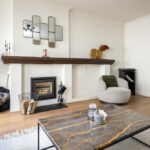 Eikenhouten vloerdelen, radiator en houtkachel.