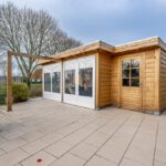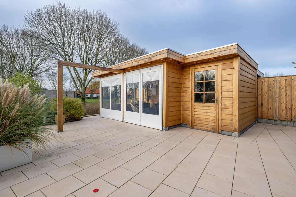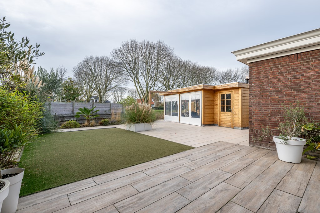 Betegeld, kunstgras, verlichting, overkapping, berging en eigen achterom.