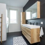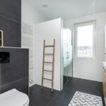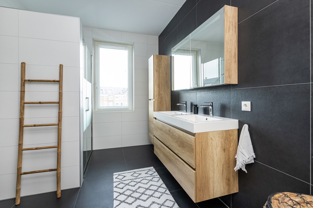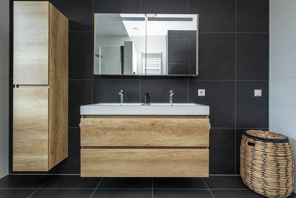 Douche, dubbele wastafel met meubel, spiegelkast, zwevend toilet, handdoekenradiator en geheel betegeld.