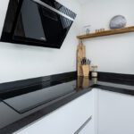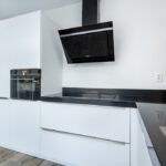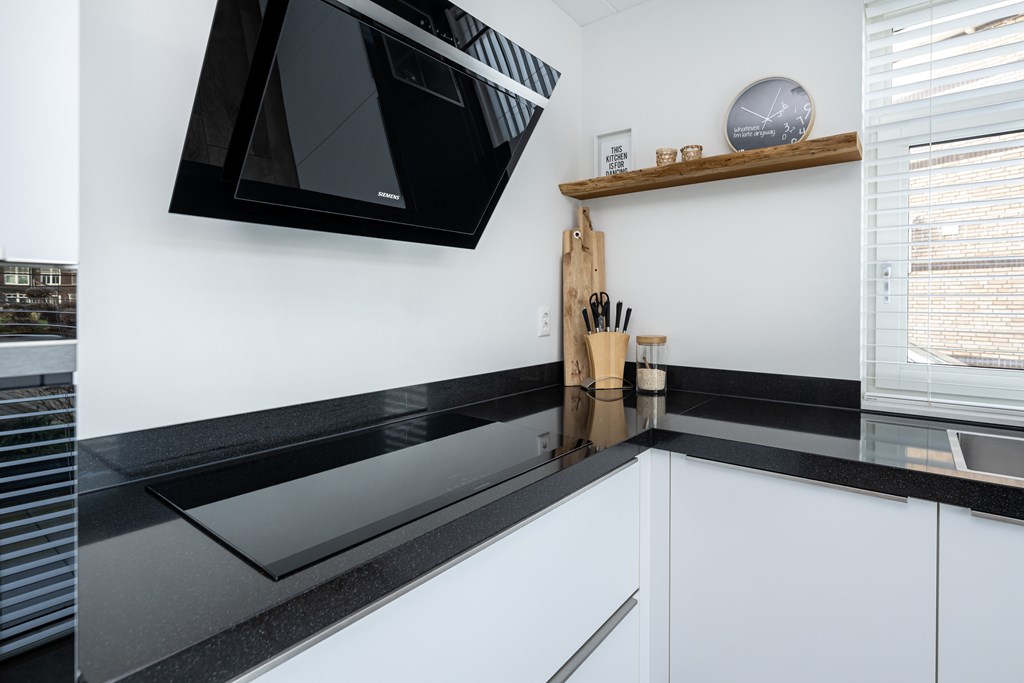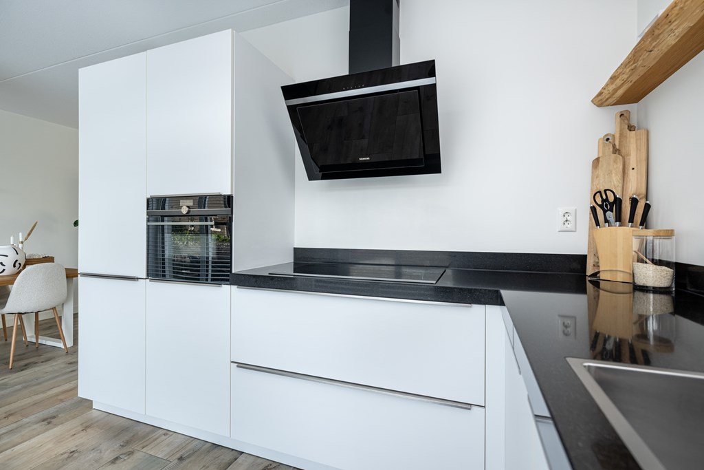 Plavuizen vloer v.v. vloerverwarming, koelkast met vriesvak, kokend waterkraan, combimagnetron, inductiekookplaat, afzuigkap, enkele spoelbak en vaatwasser.