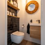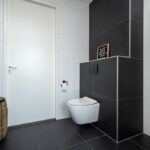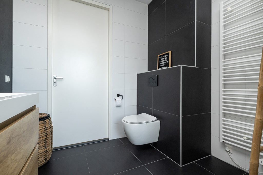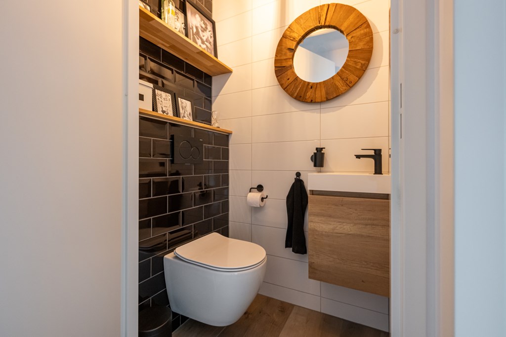 Zwevend, stankvrij, wastafel met meubel en geheel betegeld.