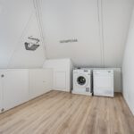Laminaatvloer, witgoedaansluitingen en Velux-dakvenster met verduistering.