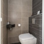 Zwevend, plavuizen vloer, wastafel, mechanische afzuiging en geheel betegeld.