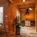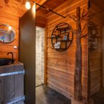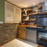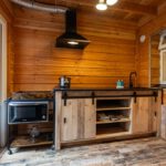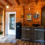 Laminaatvloer, keukenblok, badkamer, houtkachel, dubbel openslaande deuren en meubel met waskom.