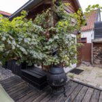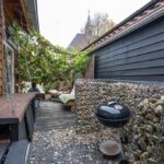 Eigen achterom, betegeld, houten vlonders en grind.