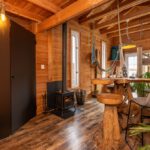 Laminaatvloer, houtkachel, radiator en spots in het plafond.