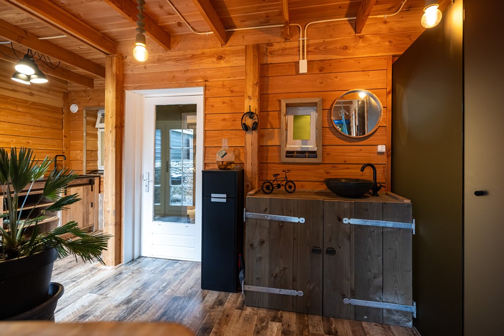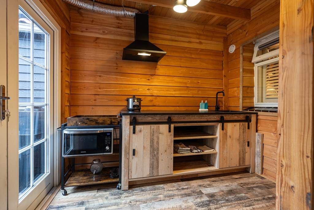 Laminaatvloer, keukenblok, badkamer, houtkachel, dubbel openslaande deuren en meubel met waskom.