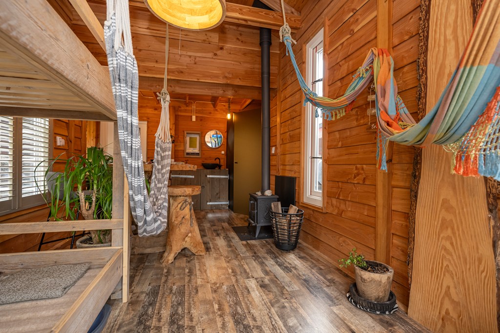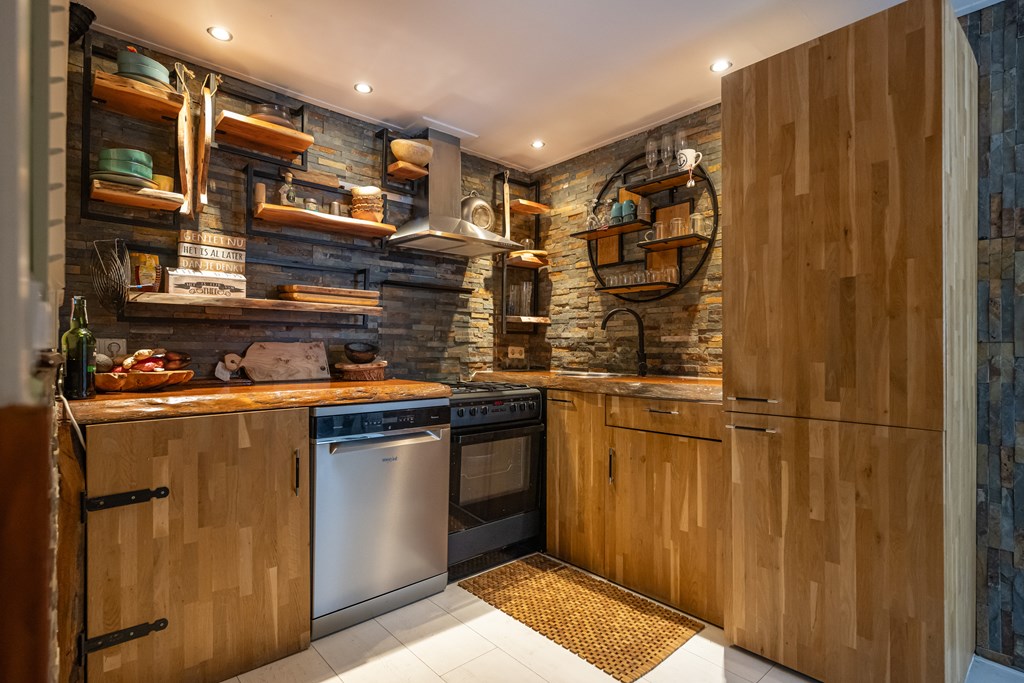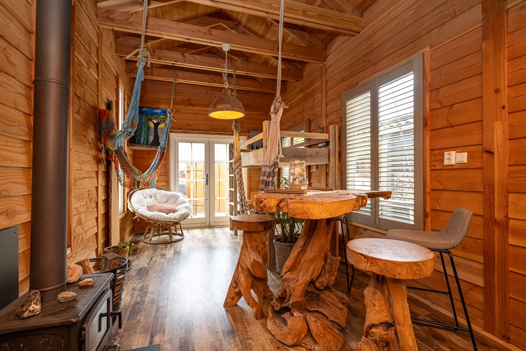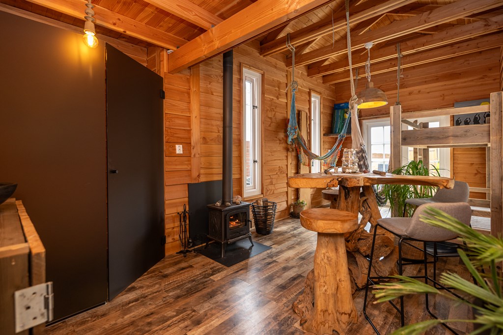 Ook het hoofdverblijf zelf straalt warmte en comfort uit. De ruime woonkamer wordt het kloppend hart van het huis, met als middelpunt de prachtige houtkachel die niet alleen voor behaaglijke warmte zorgt, maar ook een gezellige sfeer creëert tijdens de koudere maanden. In de aanbouw vindt u eveneens een houtkachel, wat bijdraagt aan de charme en het huiselijke gevoel dat deze woning zo uniek maakt.