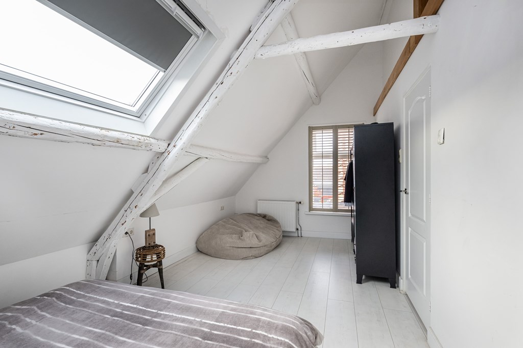 Laminaatvloer, dakkapel en radiator.