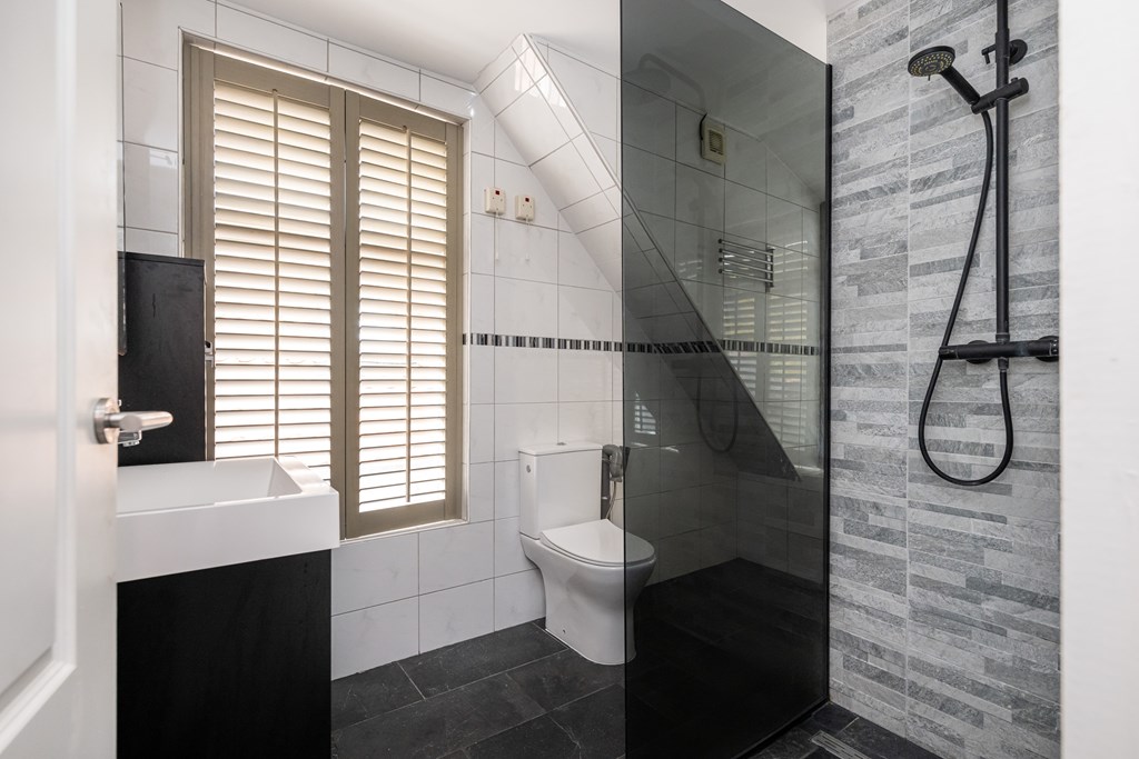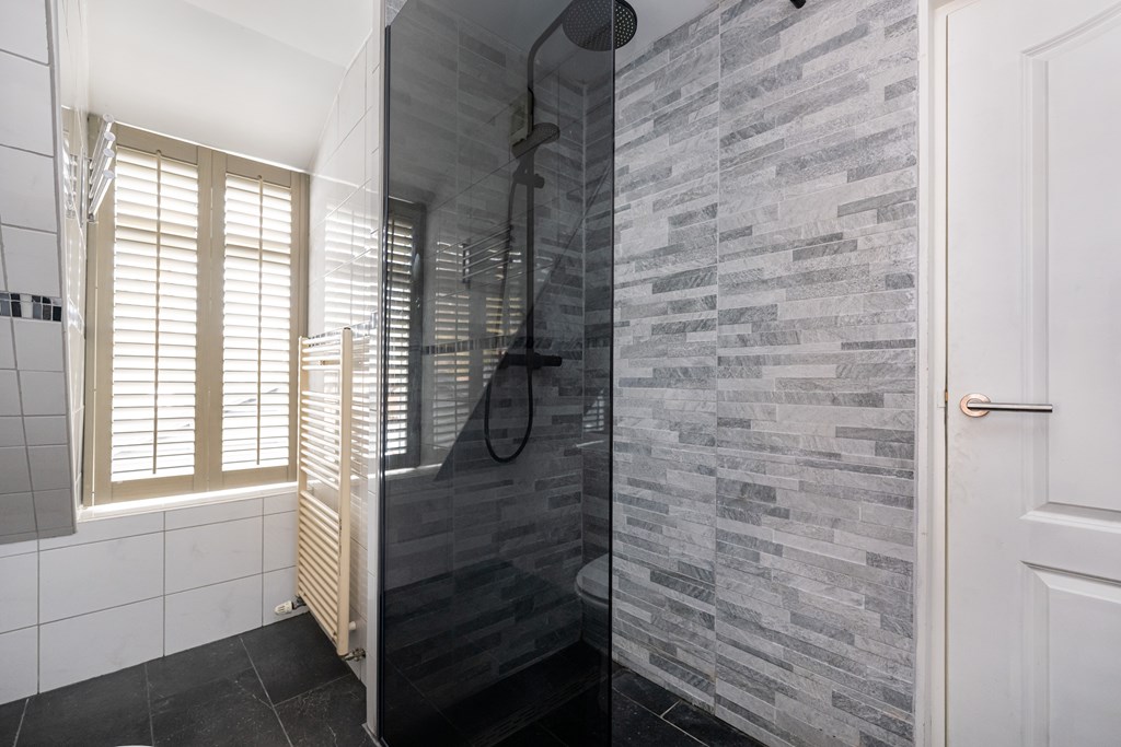 Douche, toilet, wastafel met meubel, handdoekenradiator, dakkapel, spiegelkast met verlichting, vaste kast en geheel betegeld.