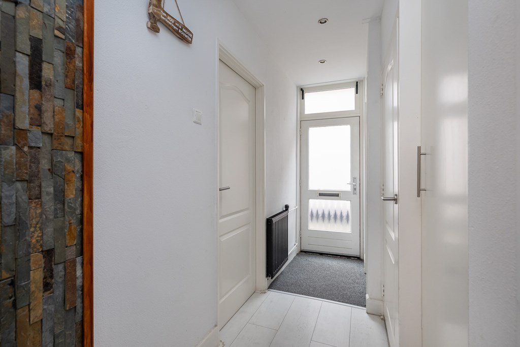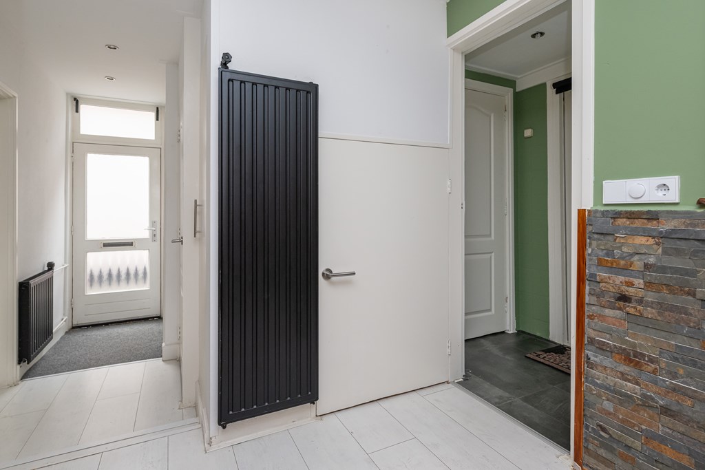 Laminaatvloer, radiator, trapopgang, garderobe en cv-ketel (Intergas 2013).