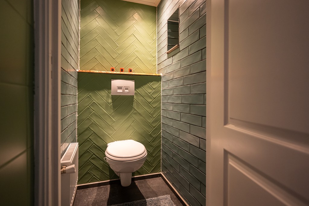 Zwevend, radiator en geheel betegeld.
