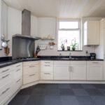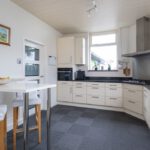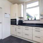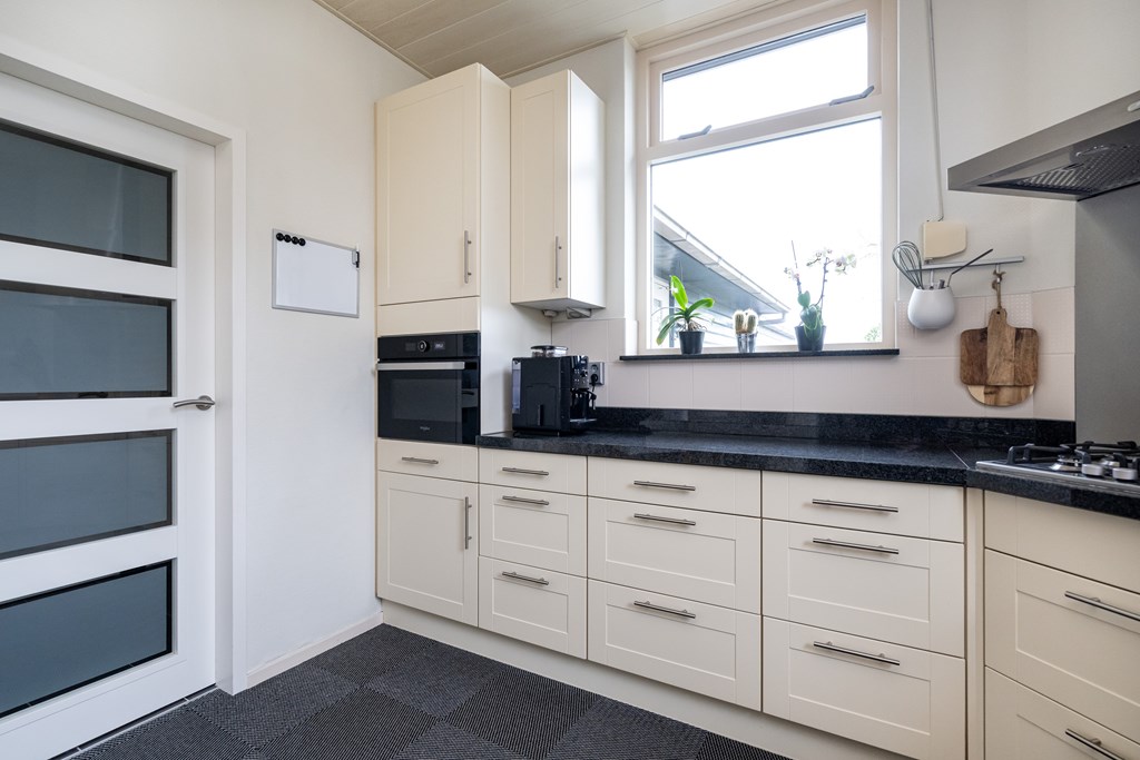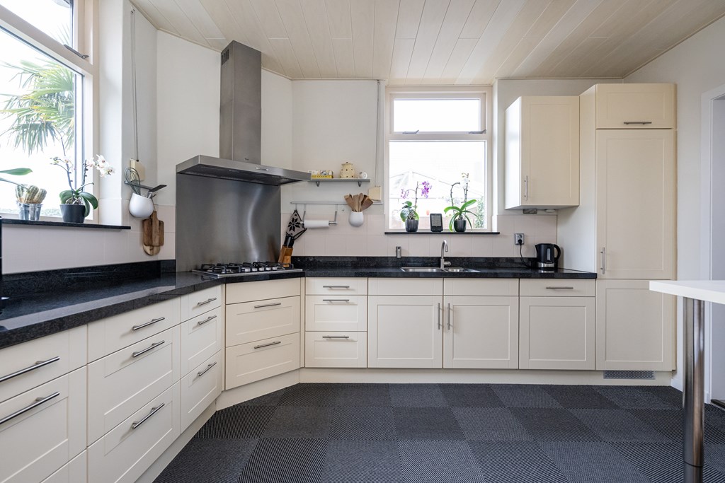 Tapijttegels, radiator, koelkast, vaatwasser, 1 ½ spoelbak, stenen werkblad, 5-pits gaskookplaat, afzuigkap en combimagnetron.