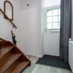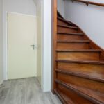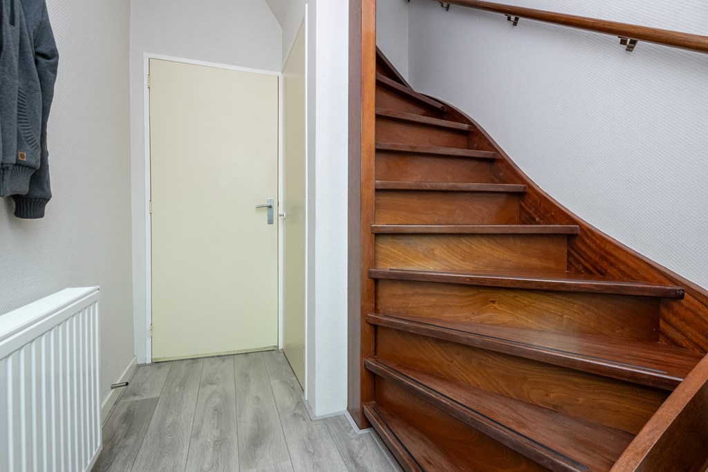 Laminaatvloer, meterkast, trapopgang, kelderkast en radiator.