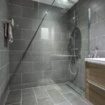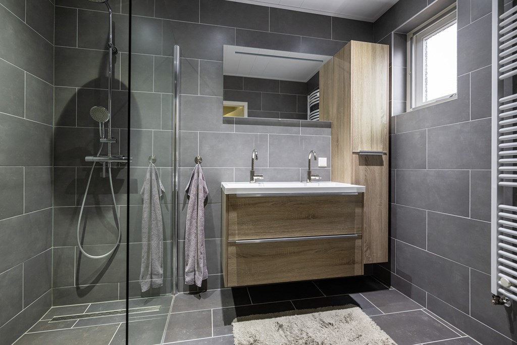 Douche, geheel betegeld, dubbel wastafel met meubel, spiegel met verlichting en handdoekenradiator.