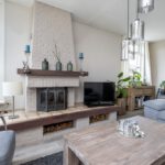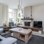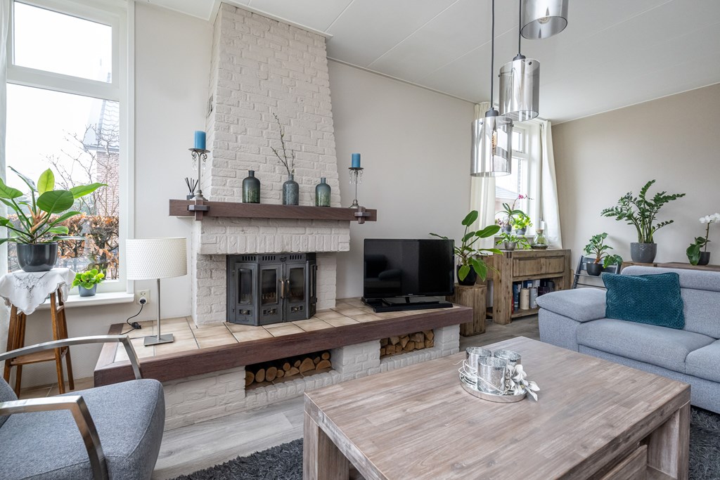 Openhaard (RVS pijp), laminaatvloer en radiatoren.