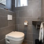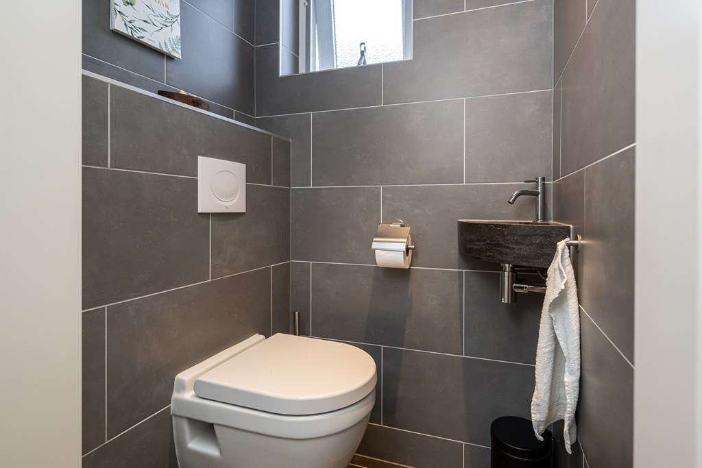 Zwevend, wastafel en geheel betegeld.