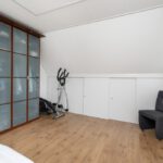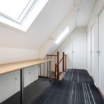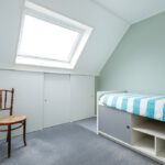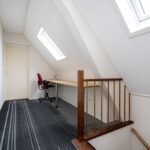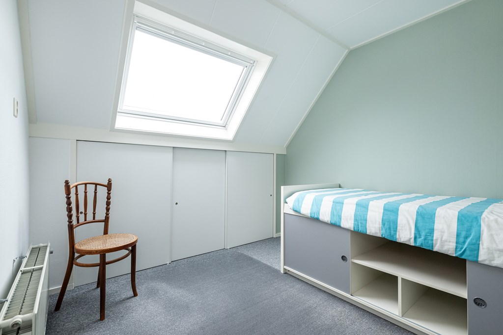 Tapijt, Velux dakvenster, radiator en schuifkast.