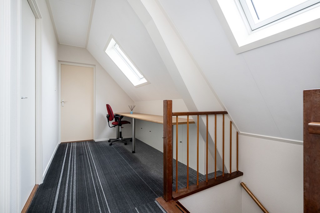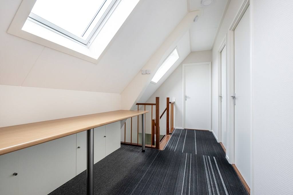 Tapijt, 2 maal Velux dakvenster met rolluik en bergkast.