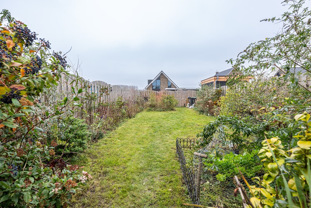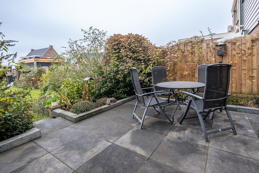 Terrassen, gras, borders, achterom, buitenkraan en zonnescherm handbediend. eigen achterom en houten berging.