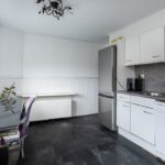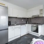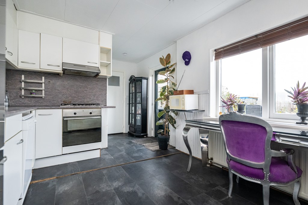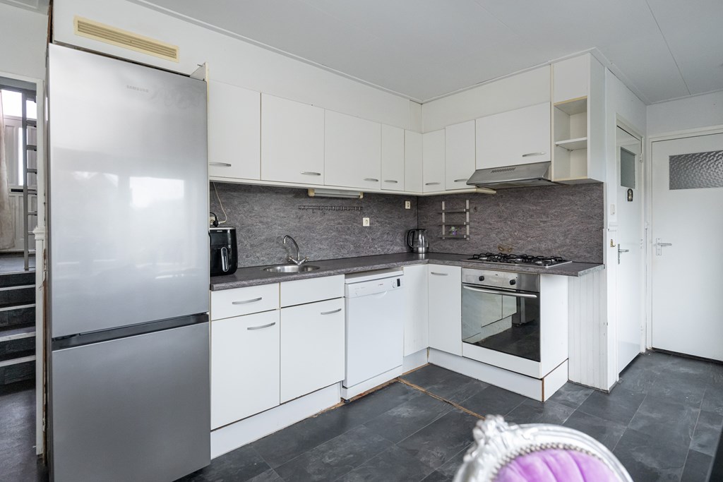 Laminaat vloer, enkele spoelbak, koel-/vriescombinatie (los opgesteld), vaatwasser, 5 pits gaskookplaat, elektrische oven, afzuigkap en radiator.