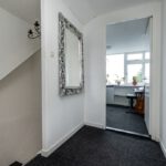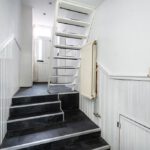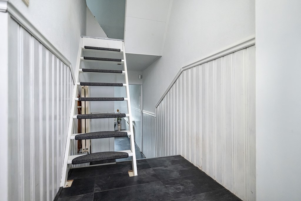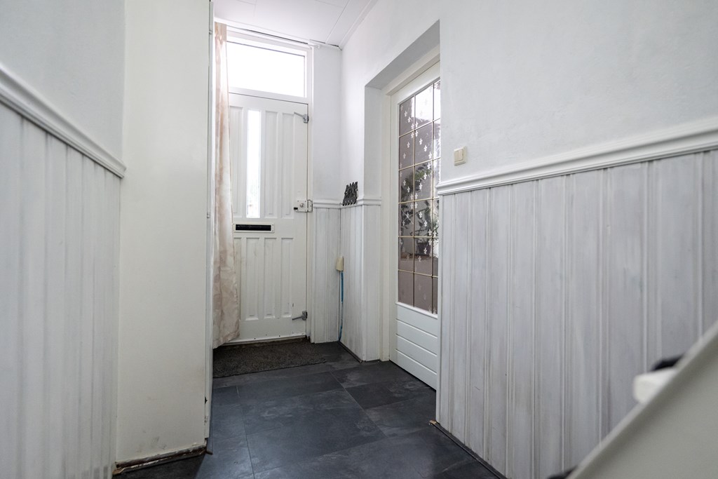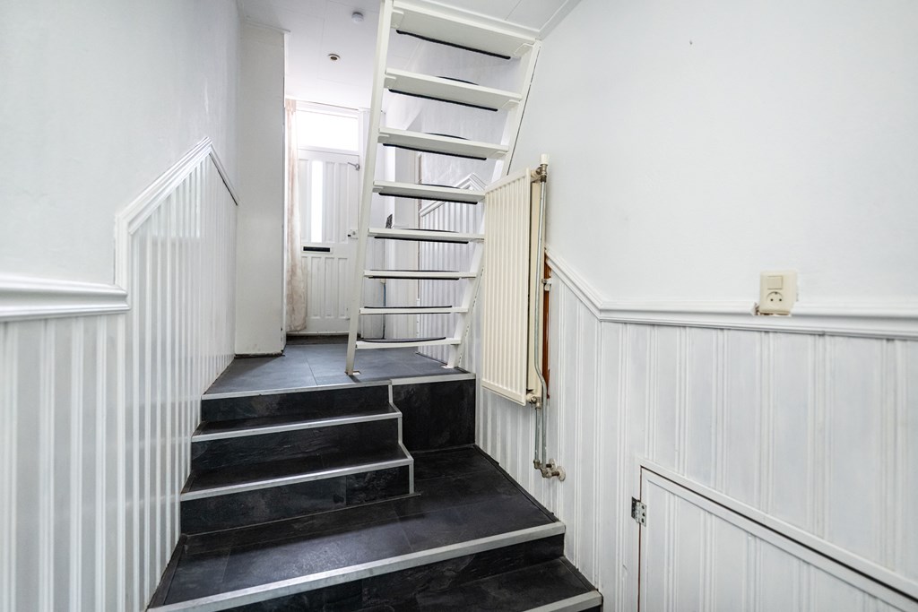 Laminaat vloer, radiator, meterkast, trapopgang naar 1e verdieping en trapafgang naar beneden gelegen keuken en sanitair.