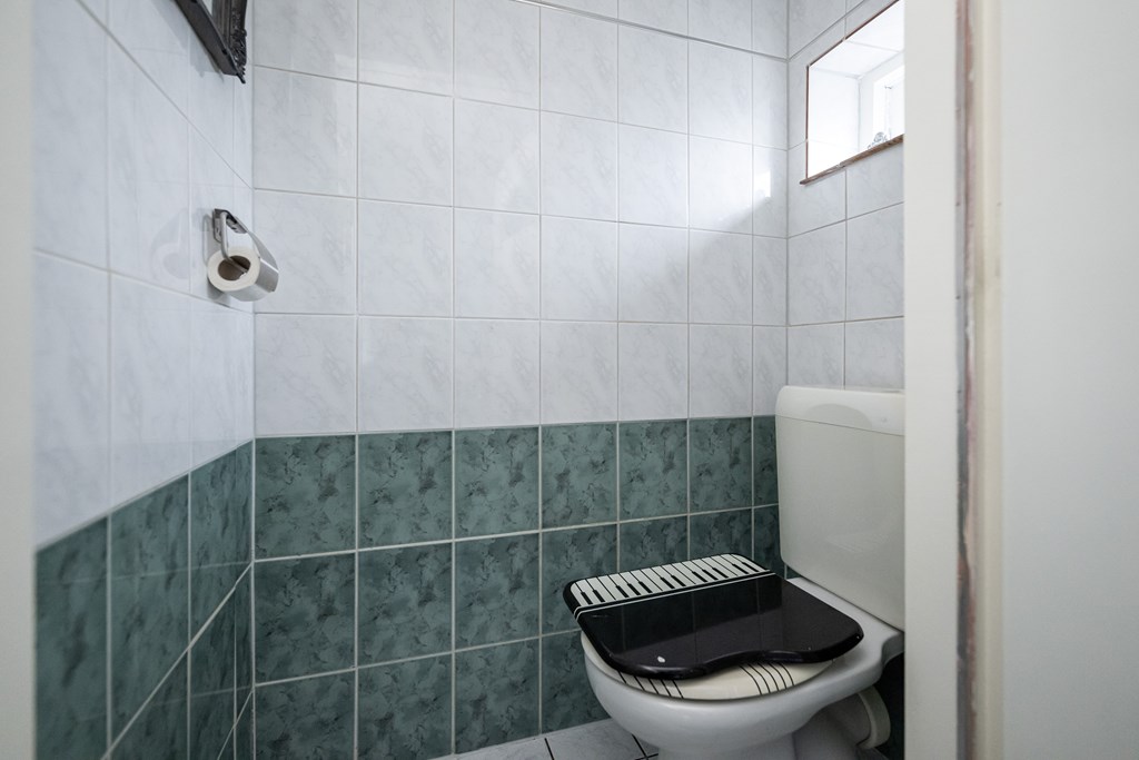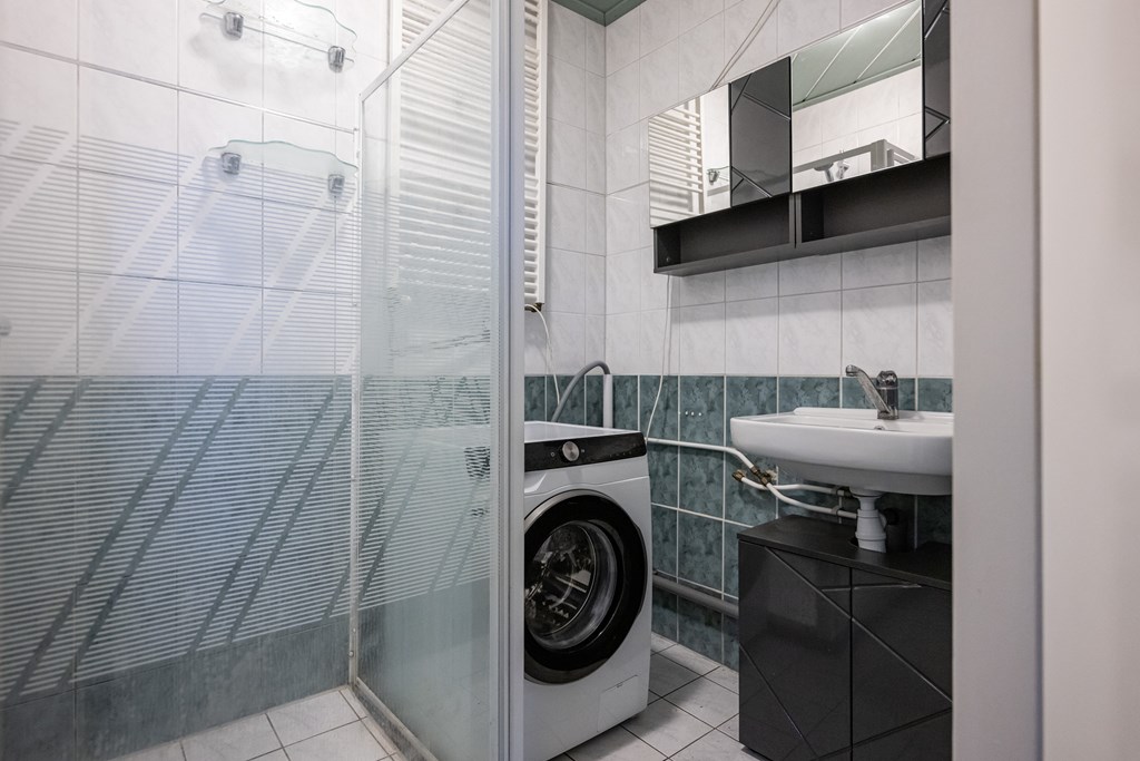 Staand, plavuizen vloer en geheel betegeld.