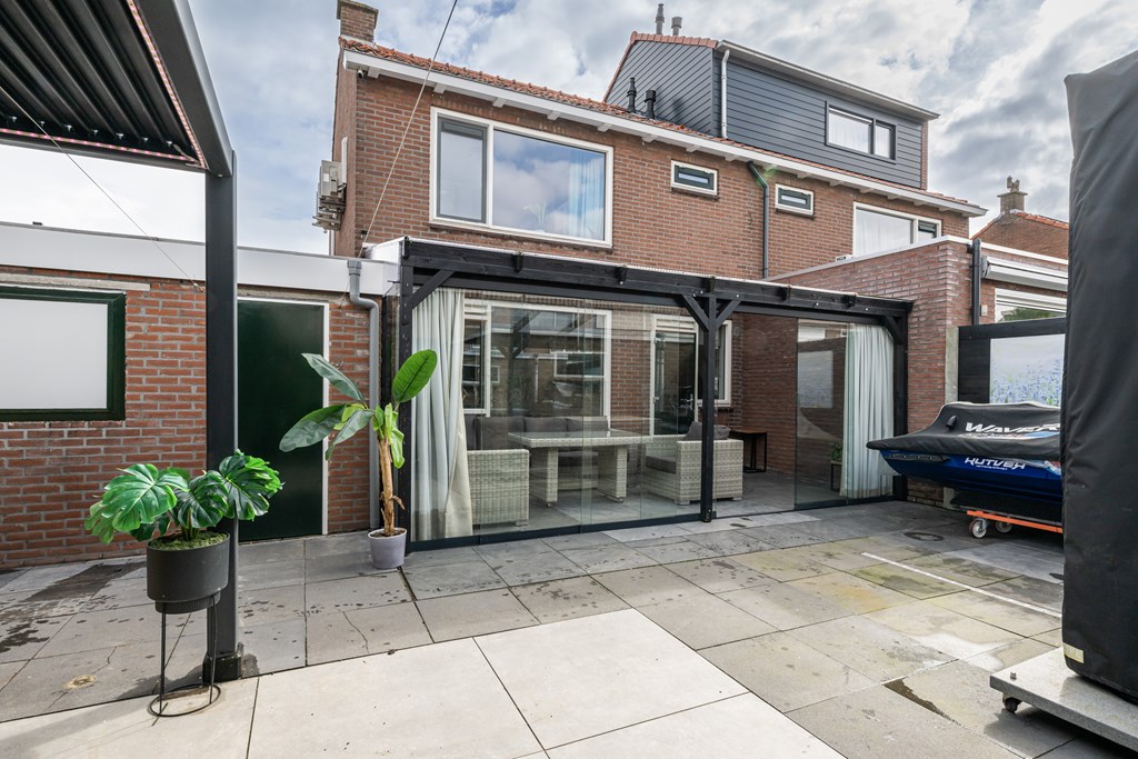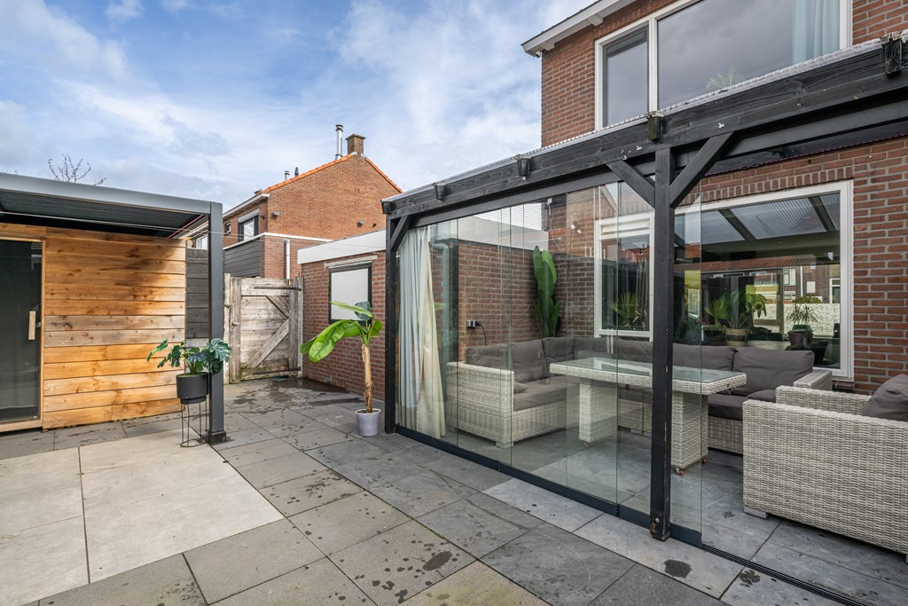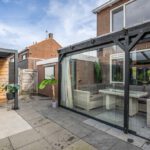 Vanuit de serre bereikt u de achtertuin op het westen. Deze zonnige ligging is ideaal voor iedereen die graag geniet van de middag- en avondzon. Hier kunt u na een werkdag nog heerlijk buiten zitten, ontspannen of gezellig dineren met familie en vrienden. De tuin biedt een fijne balans tussen zon, ruimte en privacy en is daarmee een heerlijke plek om volop van het buitenleven te genieten.