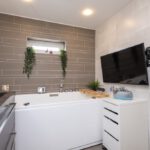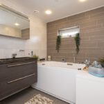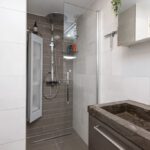 Plavuizenvloer, ligbad, wastafel met meubel, handdoekenradiator, inloopdouche, mechanische afzuiging, spots in plafond en geheel betegeld.