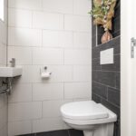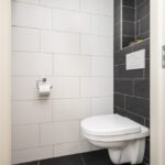 Plavuizenvloer, zwevend toilet en geheel betegeld.