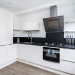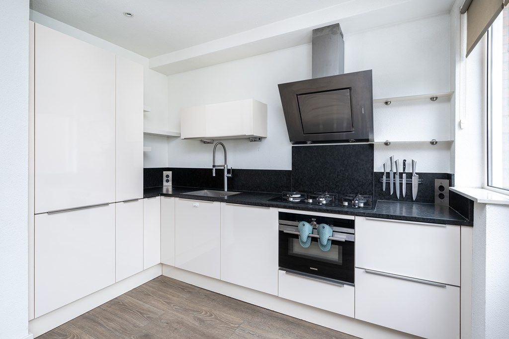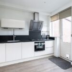 Laminaatvloer, enkele spoelbak, 5 pits gas op glas, afzuigkap, combi-oven, koelkast, vriezer, apothekerskast, vaatwasser en toegangsdeur naar de buitenkamer met glazen schuifwanden.