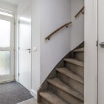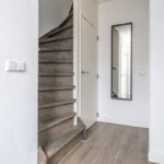 Laminaatvloer, meterkast, trapopgang, trapkast en een radiator.