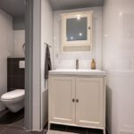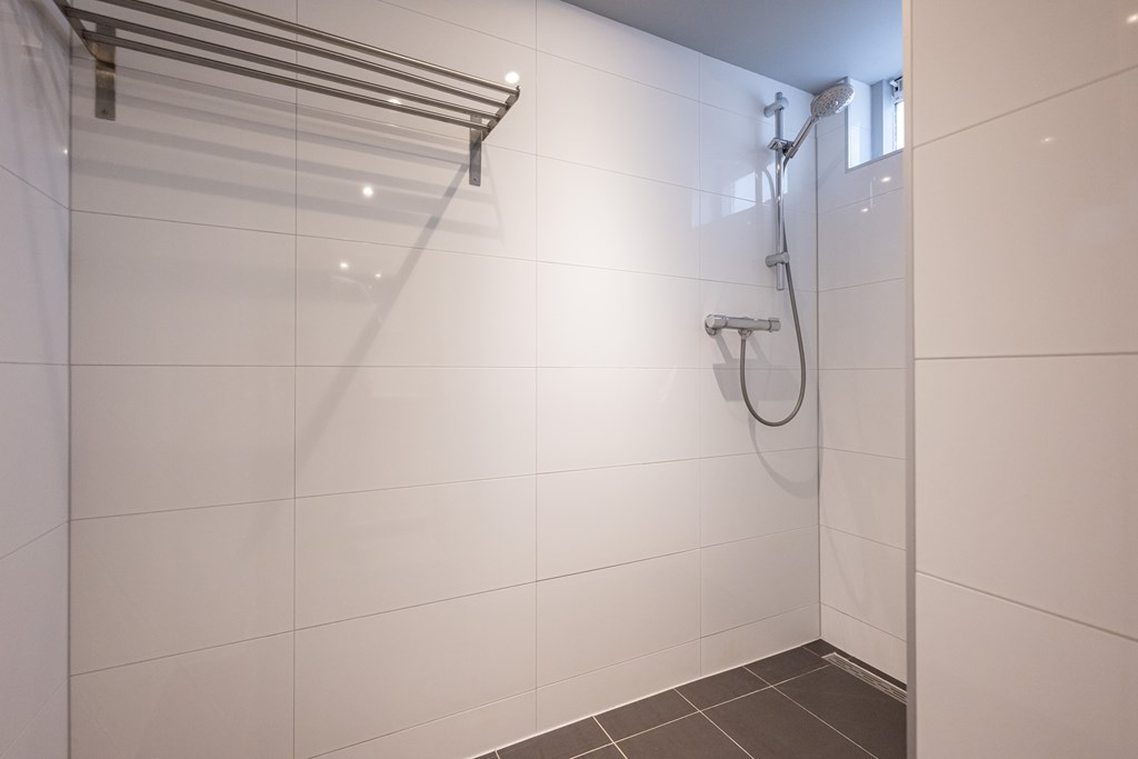 Inloopdouche, zwevend toilet, wastafel met meubel, vloerverwarming en geheel betegeld.
