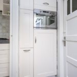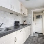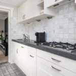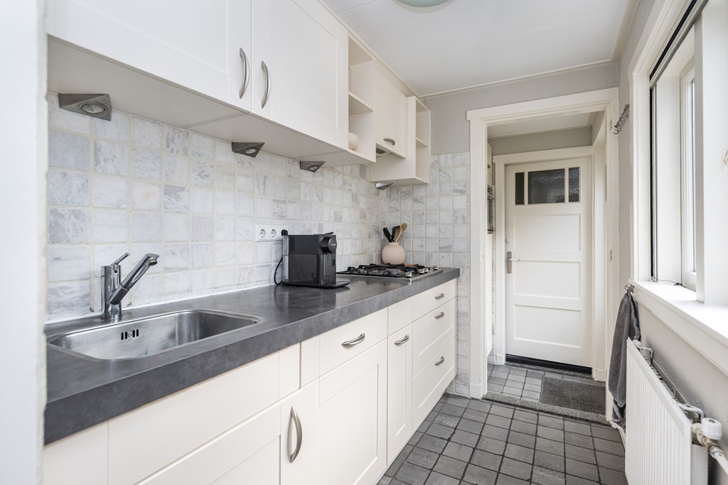 Plavuizenvloer, 4-pits gaskookplaat, afzuigkap, enkele spoelbak, vaatwasser, koelkast, apothekerskast, combi-oven, radiator, rolluik en deur naar achtertuin.