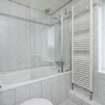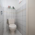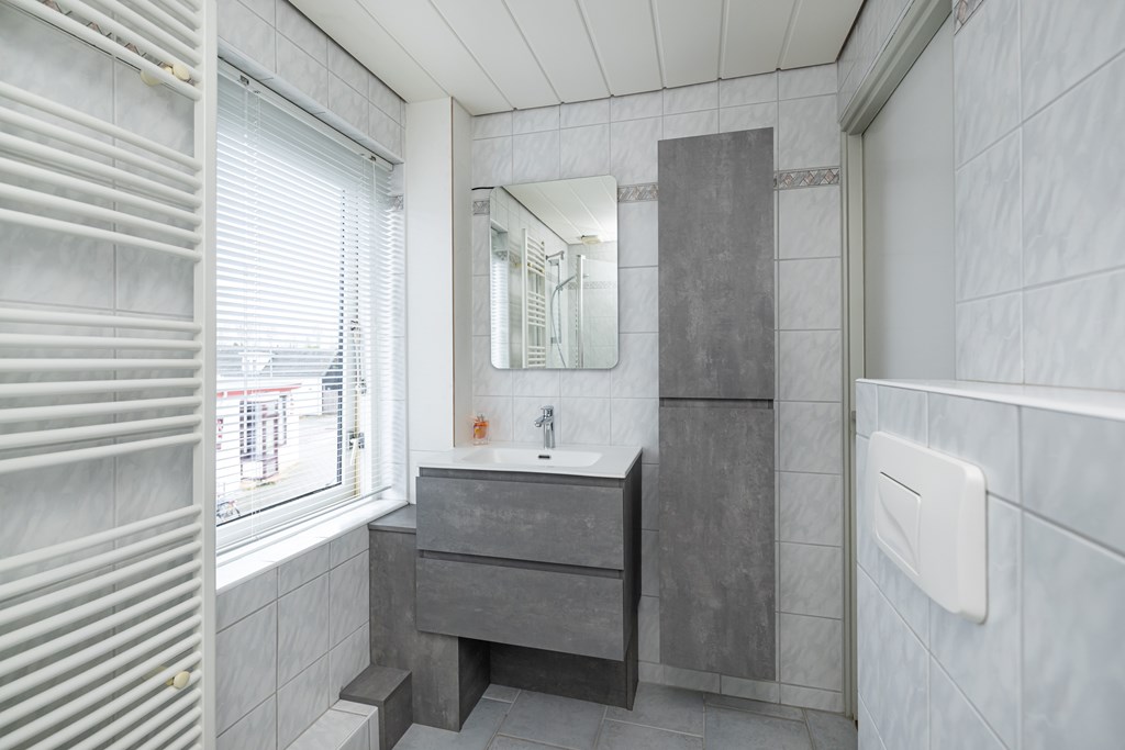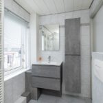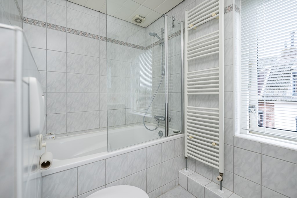 Plavuizenvloer, zwevend toilet, ligbad met douchegelegenheid, elektrische afzuiging, wastafel met meubel, handdoekenkast, handdoekenradiator en geheel betegeld.