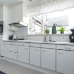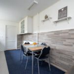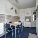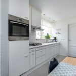 Plavuizenvloer, groepenkast, radiator, spots en toegang tot achtertuin.