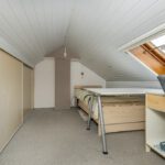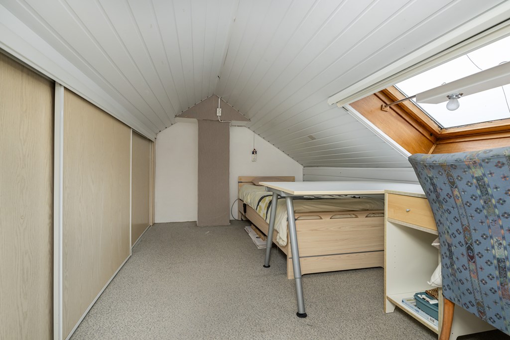 Vloerbedekking, Velux-dakvenster, radiator en schuifdeuren met achterliggende bergruimte.